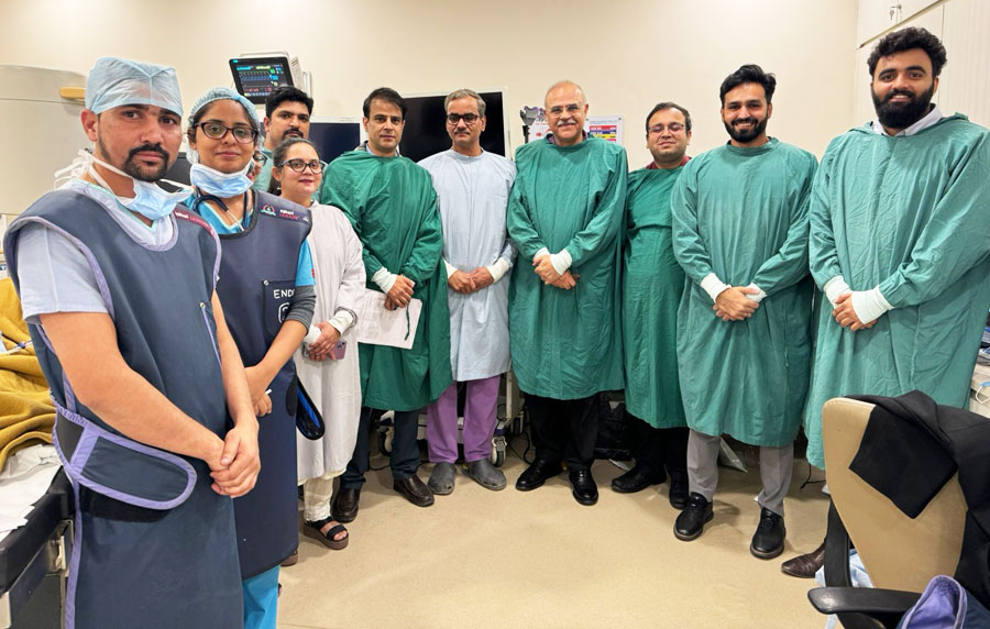 Happy to share a first for us at Manipal Hospital Delhi on 30th November: Endoscopic Ultrasound (EUS) guided Choledocho-Duodenostomy for relief of malignant biliary obstruction. Mr SL, 68 years, was hospitalized with us for obstructive jaundice and cholangitis. Evaluation revealed growth in head of pancreas with liver mets. EUS Guided FNA with ROSE ( Rapid Onsite Evaluation) by pathologist confirmed Adenocarcinoma pancreas. At ERCP the guide-wire could not be negotiated proximal to the growth in pancreas. Such patients with failed ERCP are normally referred worldwide for PTBD(percutaneous trans-hepatic biliary drainage). We decided, instead, to access the bile duct, proximal to the obstruction, from the duodenum(D1) and with EUS guidance, place a Lumen Apposing Metal Stent(LAMS), thus establishing biliary drainage into duodenum. Procedure time was under 15 minutes and the patient is doing well.